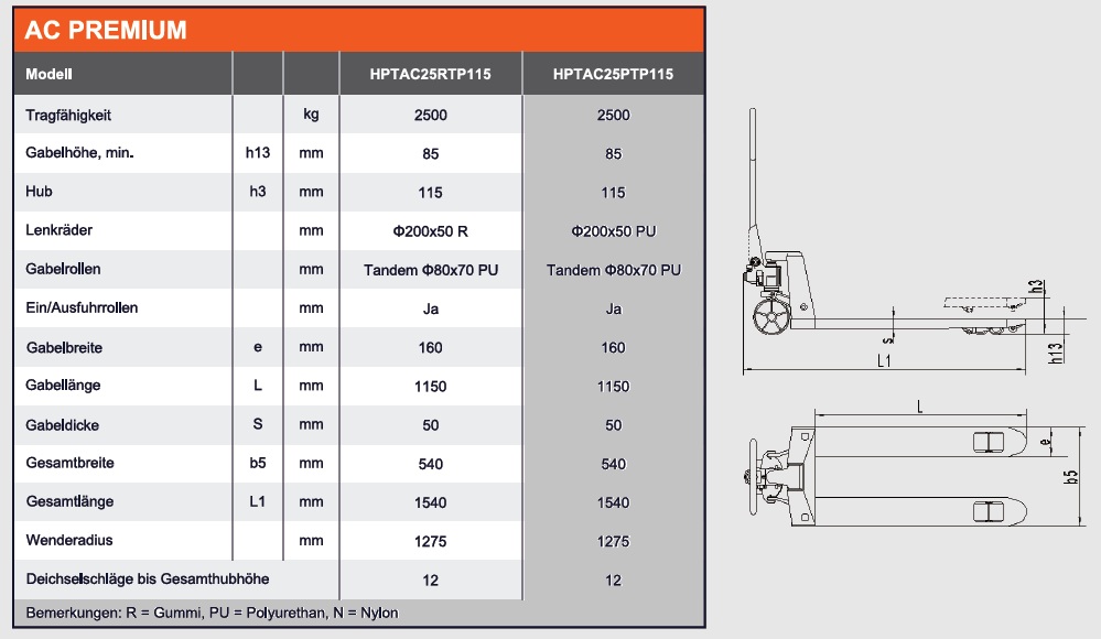 2,5t Noblelift AC Premium Handhubwagen mit Polyurethan Lenkrädern ''HPTAC25PTP115''